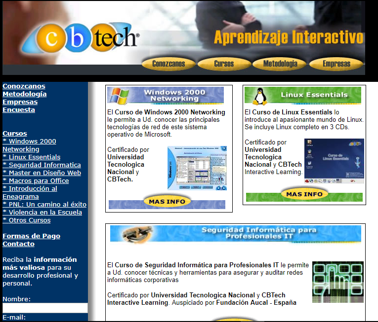 En 1999 se funda el CBTech en Córdoba, Argentina con el objetivo de ofrecer servicios de E-Learning corporativo. Desarrolla un software basado en CD-ROM para la formación empresarial. Estos CDs contenían cursos relacionados con la Ofimática, la Higiene y Seguridad Alimentaria, la utilización de software para Checkout (caja) en supermercados e hipermercados.